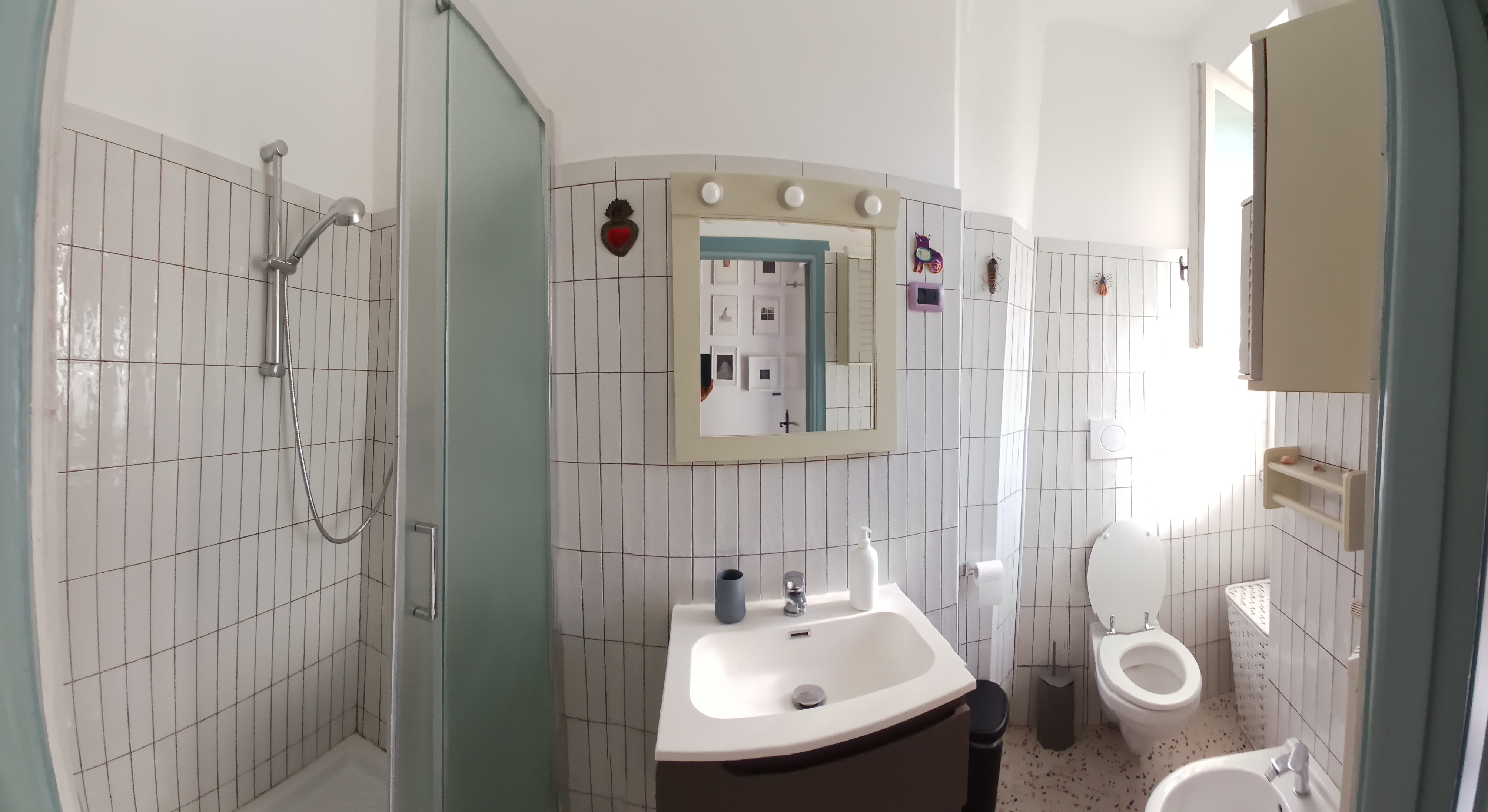 Nel bagno c’è una cabina doccia, lavandino, wc e bidet, saponi, tutto il necessario per le pulizie e un phon.