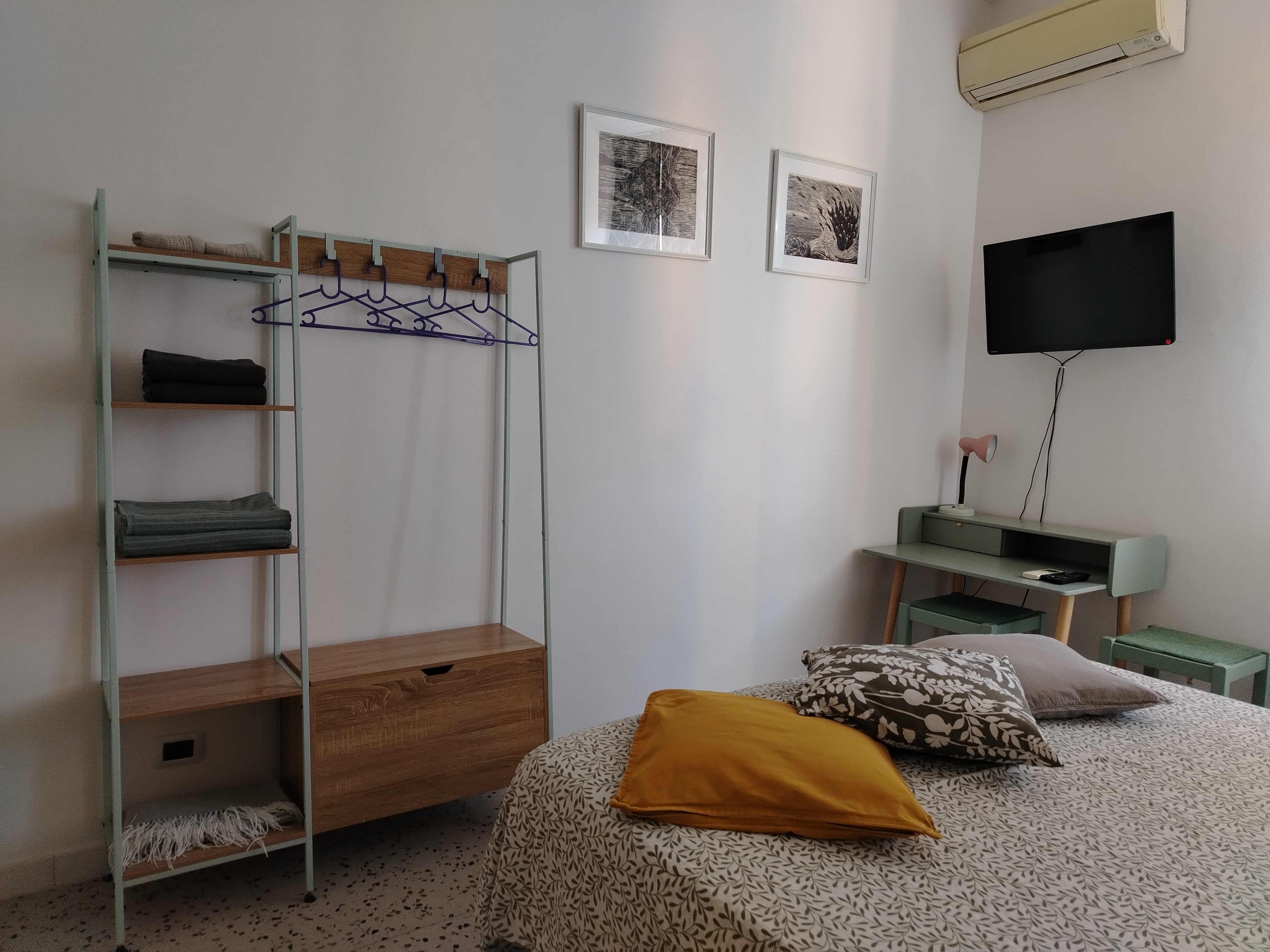 La camera da letto affaccia nel giardino ed è fornita di letto matrimoniale, poltrona letto singola, armadio a giorno, angolo di lavoro con piccola scrivania, WiFi ed internet TV.